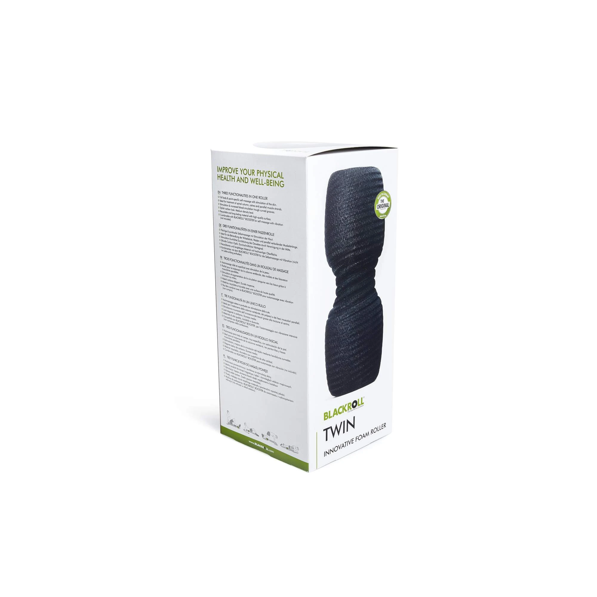 Die Twin kombiniert die beiden Modelle Blackroll Standard und Duoball 12 in einer Rolle. Die besondere Oberflächenstruktur stimuliert Muskelgewebe und Haut. Dabei eignet sich die Doppelrollenform besonders für parallele Muskelstränge, wie sie z. B. an der Wirbelsäule. Für Einsteiger und empfindlichere Personen wird der Druck auf die Wirbel deutlich reduziert, was eine angenehmere Behandlung gewährleistet. Kombiniert mit dem Blackroll Booster (separat erhältlich), kann die Rolle auch mit Vibration ausgestattet werden.