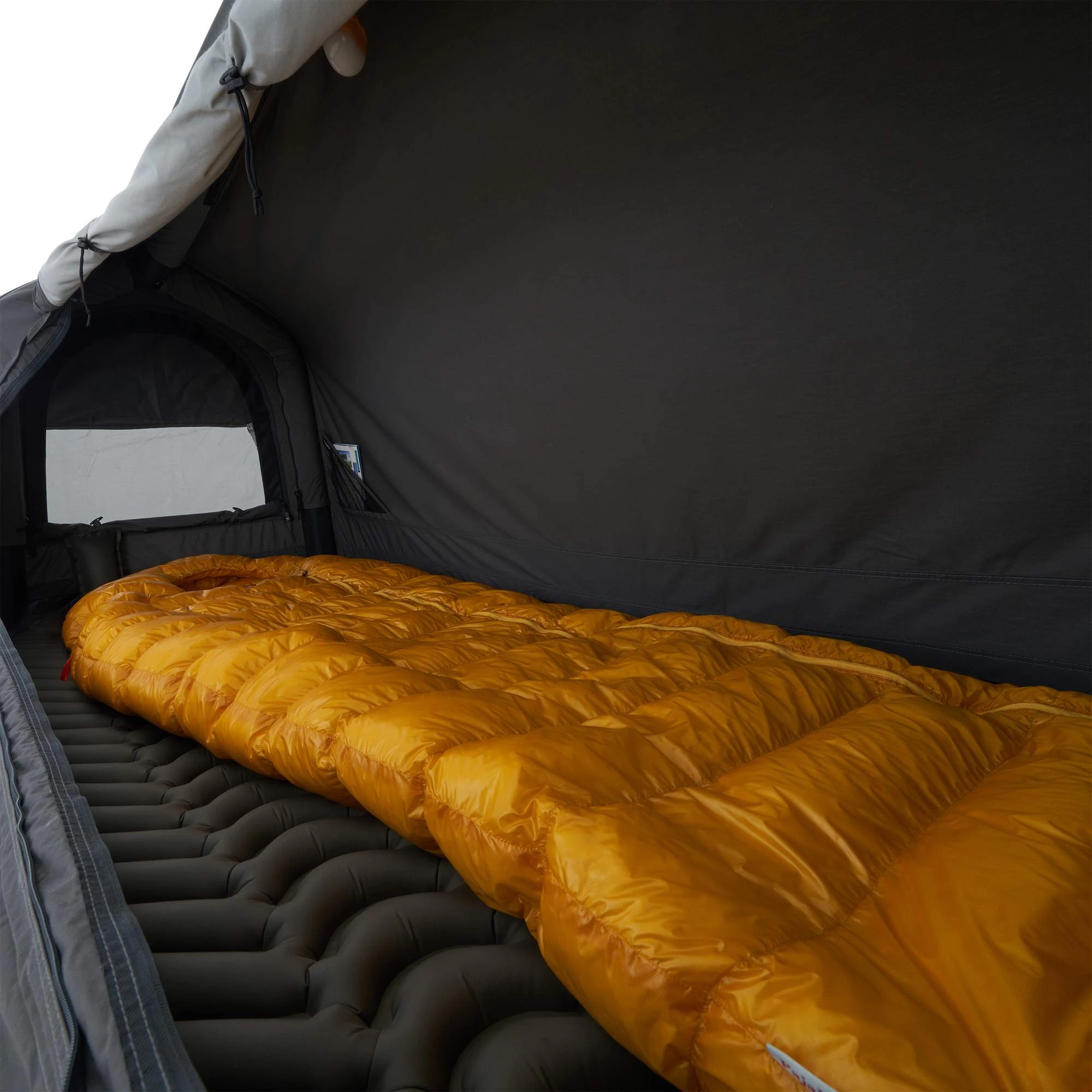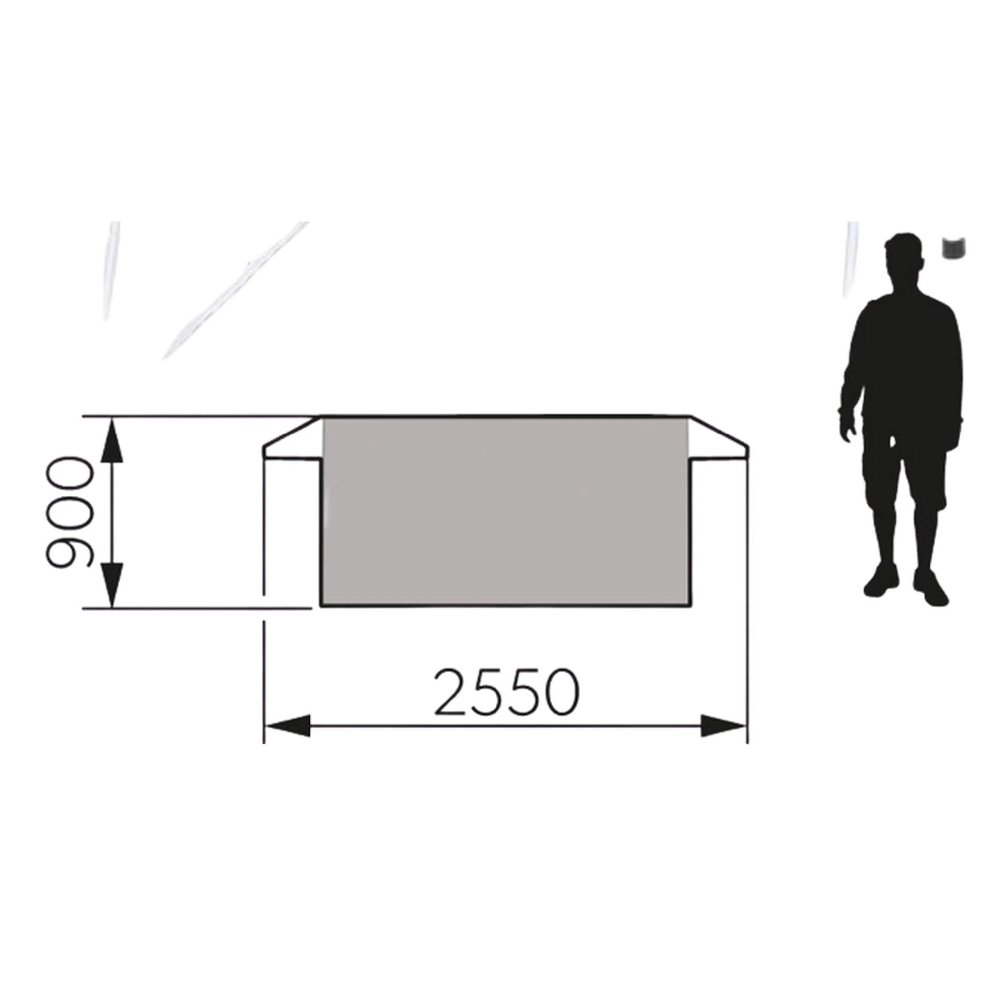 Im Kopf- und Fußbereich befinden sich große Lüftungsöffnungen mit Moskitonetz, die je nach Bedarf zum Teil oder vollständig geschlossen werden können. Im Inneren ist Platz genug für deinen Schlafsack und zum Verstauen deiner Kleidung. Zur weiteren Ausstattung gehört eine Netztasche für Kleinteile und eine Kabeldurchführung ins Innenzelt, die mit einem Reißverschluss verschlossen werden kann. Ein Karabiner erlaubt dir das Aufhängen einer Zeltlaterne unter der Decke.